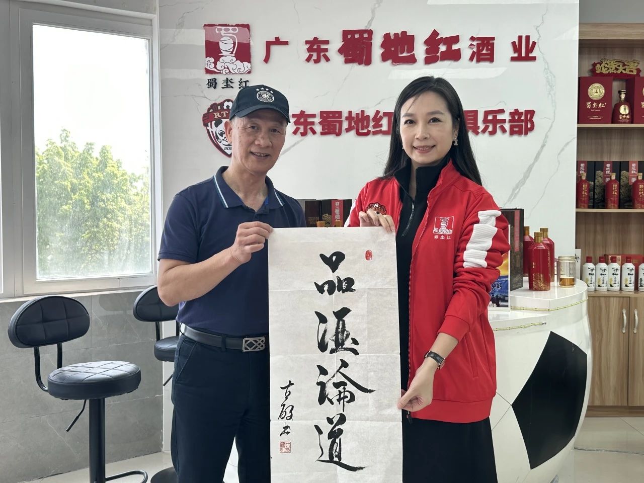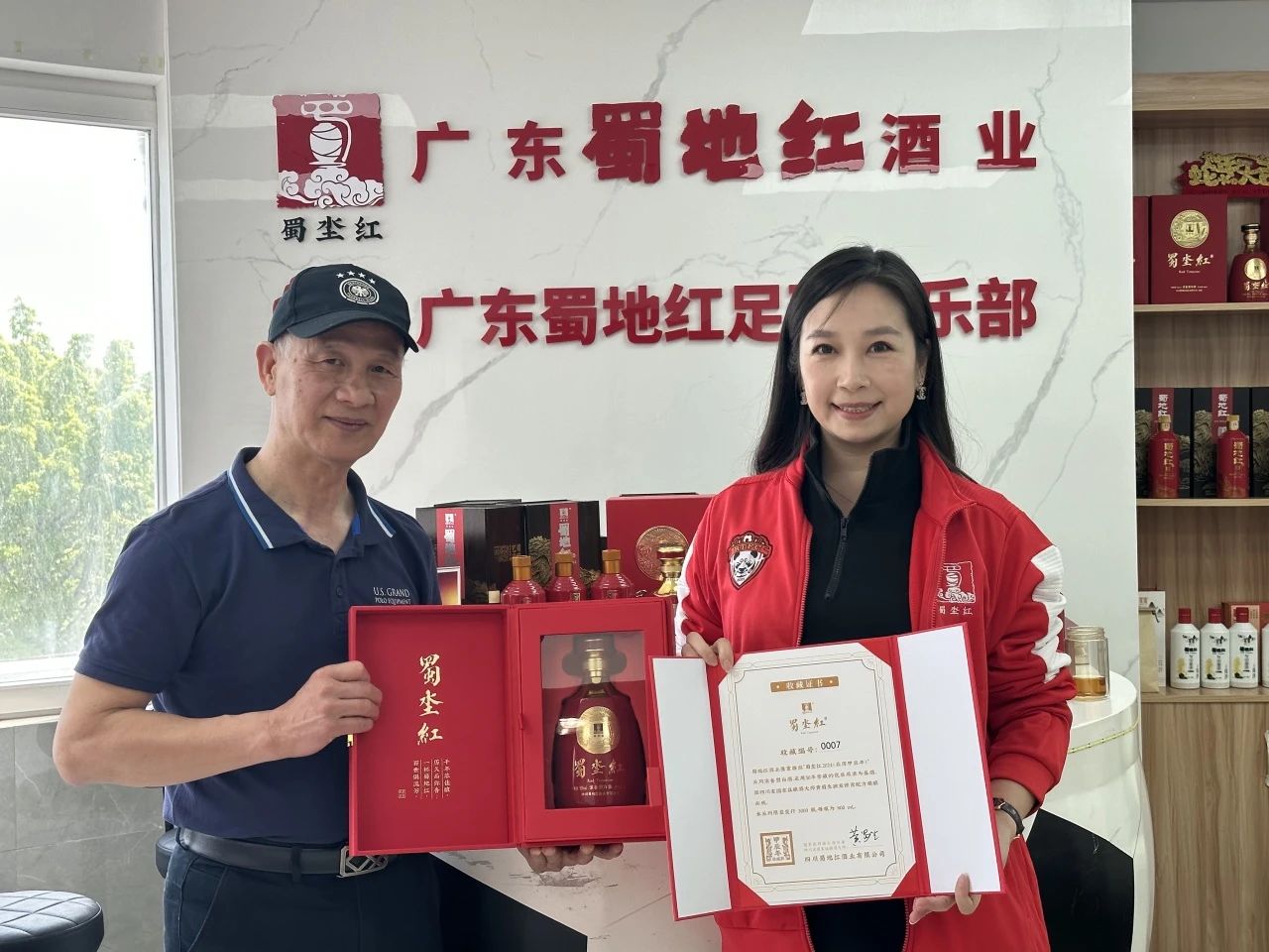古广明前辈一直对蜀地红酒业的真诚态度及对传统酿造工艺的传承与坚持赞赏有加。此次回国,他特意准备了自己的墨宝,作为礼物赠予蜀地红酒业总经理何丽丽女士,以此表达他对蜀地红的深厚情谊与美好祝愿。而在此之前,蜀地红也为古广明前辈精心准备了一份特别的礼物——编号为0007的甲辰年限量版蜀坔红浓香型白酒。这份礼物不仅是对古广明辉煌职业生涯的崇高致敬,也象征着双方之间珍贵的友谊和相互尊重。