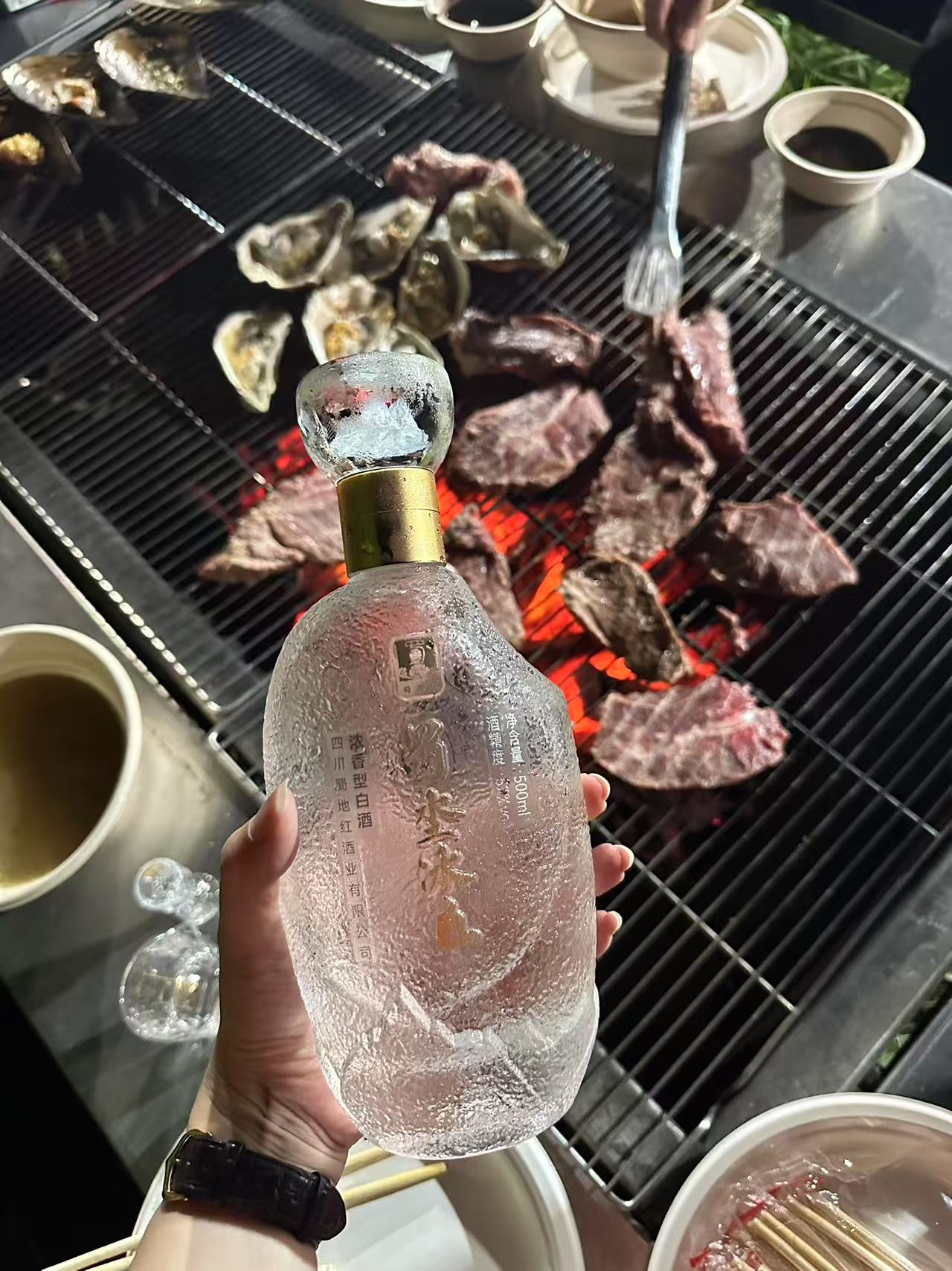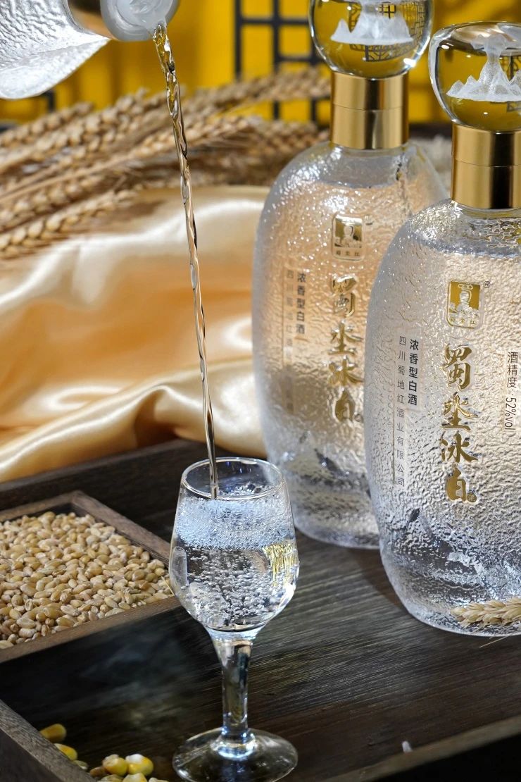 蜀坔冰白的瓶身设计深植酿酒文化精髓:米粒造型致敬五谷精华,冰川纹理磨砂工艺传递自然灵韵,通透的酒体在冰镇后更显晶莹剔透,宛若凝固的冰魄。倾杯时酒液流转清透,挂杯痕迹细腻雅致,既延续了白酒的东方美学,又契合现代审美对简约与品质的追求。