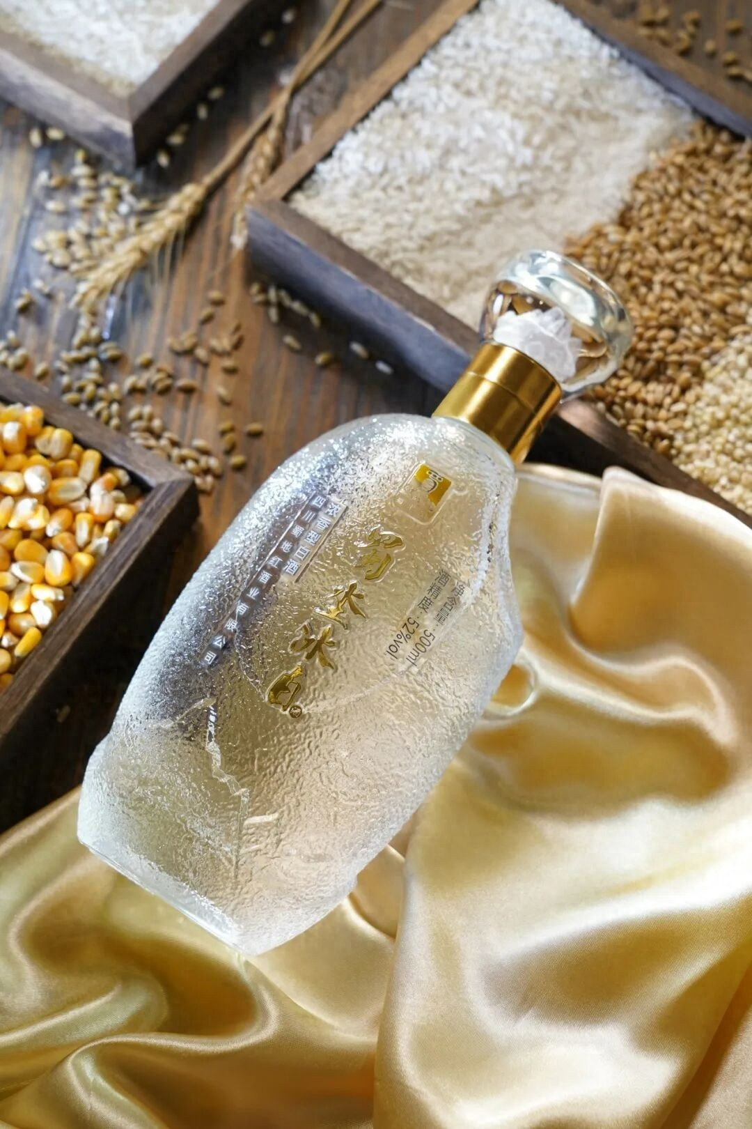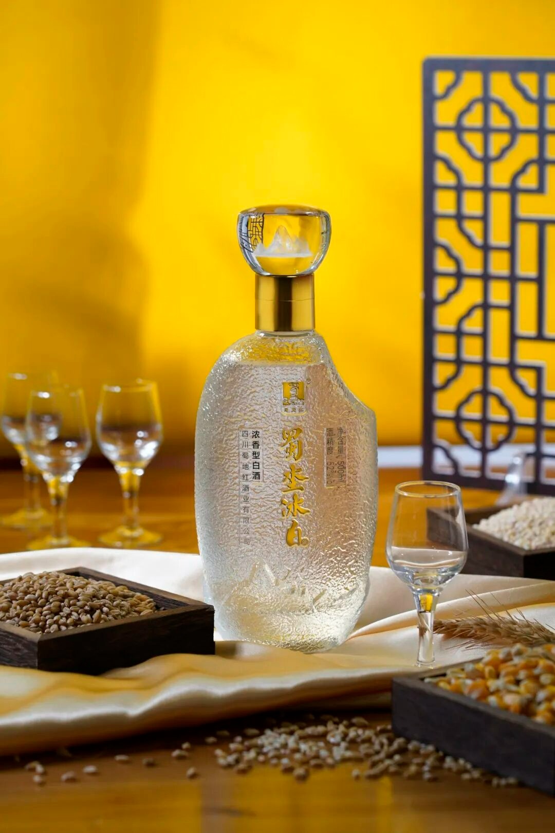 “蜀坔冰白”不只是一瓶酒,更是对品质生活的至臻追求。其瓶型设计简洁大方,形如一粒饱满的大米,寓意好酒从优质粮食始,不忘初心,方得始终。瓶身采用带有冰川纹理的玻璃材质,清冷纯净,宛若凝固的冰川,尽显自然之美。执于掌心,凉意沁肤,触感温润,视觉与触觉皆成享受。整体设计简约而不失雅致,与“蜀坔冰白”清冽纯净的气质浑然天成,彰显不凡格调。